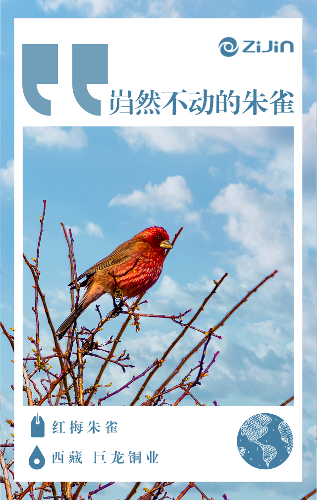 巨龙铜业员工在矿区门口偶遇觅食中的红眉朱雀。红眉朱雀主要栖息于海拔1500米以上山区,主要吃草籽、浆果、嫩芽等植物,受惊扰时“僵”于树丛不动直至危险消失。