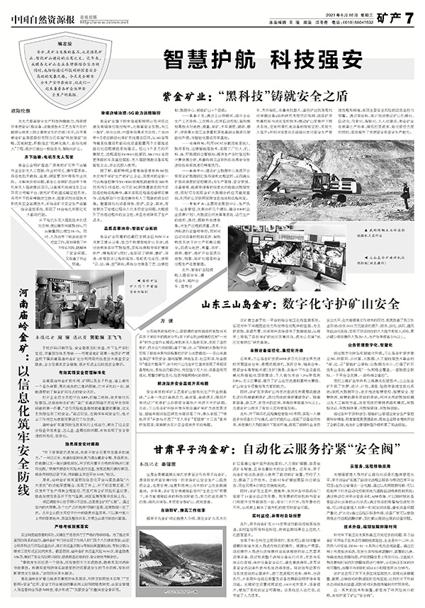 安全,是矿业发展的基石,也是绿色矿山、智慧矿山建设的应有之义。在全国安全生产宣传咨询日(6月16日)当天,中国自然资源报刊文《紫金矿业:“黑科技”铸就安全之盾》,推介紫金矿业通过科技创新探索安全高效的发展之路。原文如下: