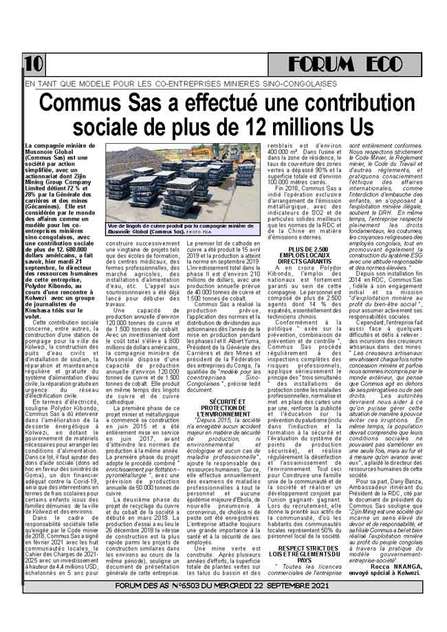 La compagnie minière de Musonoïe Global (Commus Sas) est une société par action simplifiée, avec un actionnariat dont Zijin Mining Group Company Limited détient 72 % et 28% par la Générale des carrières et des mines (Gécamines). Elle est considérée par le monde des affaires comme un modèle pour les coentreprises minières sino-congolaises, avec une contribution sociale de plus de 12. 680.000 dollars américains, a fait savoir, hier mardi 21 septembre, le directeur des ressources humaines de cette entreprise, Polydor Kibondo, au cours d'une rencontre à Kolwezi avec un groupe de journalistes de Kinshasa triés sur le volet.