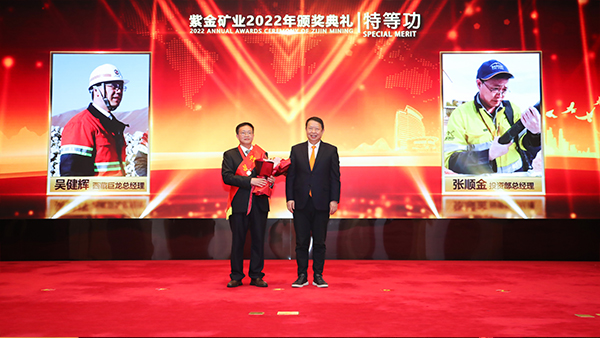 在本次表彰中,以巨龙铜业总经理吴健辉为代表的巨龙团队获得特殊奖励金、先进单位、优秀项目等多项奖项,吴健辉获得特等功荣誉称号。2019年6月以来,吴健辉带领团队直面老巨龙长期停工、历史遗留问题繁杂等诸多困难,克服高原缺氧、高寒、低压的极限挑战,团结50多家协作方,发扬老西藏精神和“艰苦创业、开拓创新”的紫金精神,点燃了一场紧锣密鼓的建设热潮,施工计划科学安排,工程瓶颈稳步突破,上百项安全、设计、建设、安装、调试等方面的难题逐一攻克,高峰期参建人员达7000余人,最终仅历时一年半,于2021年12月底建成我国最大的世界级铜矿,创造了最高海拔的“紫金速度”和“紫金奇迹”。