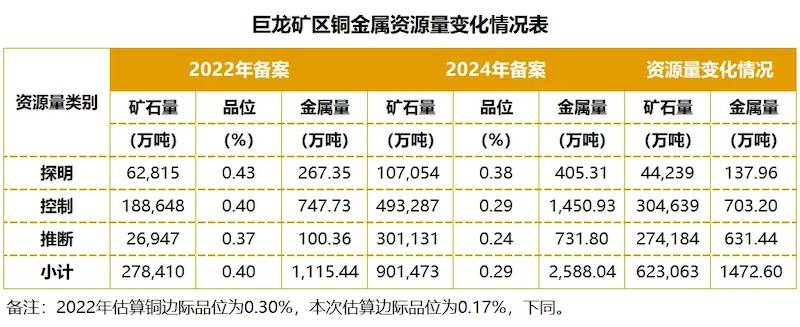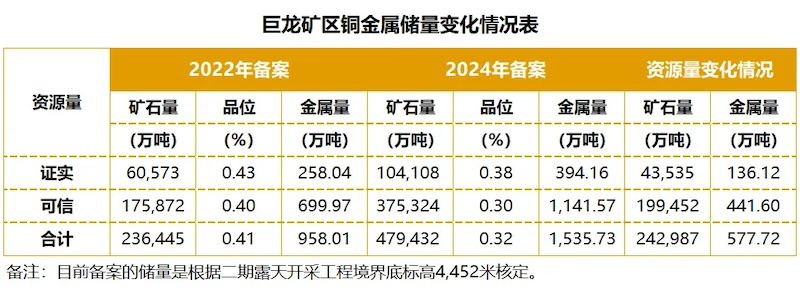 根据新的评审意见,巨龙矿区新增铜资源量达1472.6万吨。新增备案完成后,巨龙铜矿铜资源量达2588万吨,平均品位0.29%,约为紫金矿业2020年并购时核实资源量的2.5倍,也是中国目前备案资源量最多的铜矿山。另新增伴生资源钼资源量100.2万吨、银资源量8157吨。