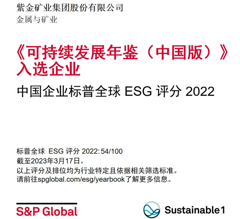 紫金矿业入选标普全球首期《可持续发展年鉴(中国版)》