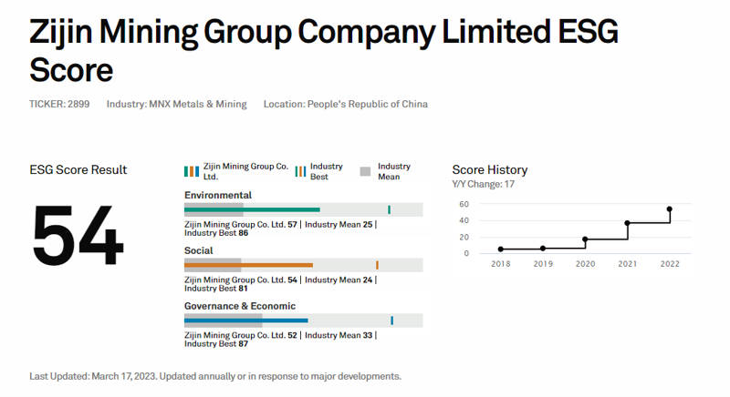 2022年,紫金矿业的标普全球CSA评分从2021年的37分跃升至54分(金属与采矿行业平均分31分),连续三年实现大幅提升,位于全球矿业前12%。